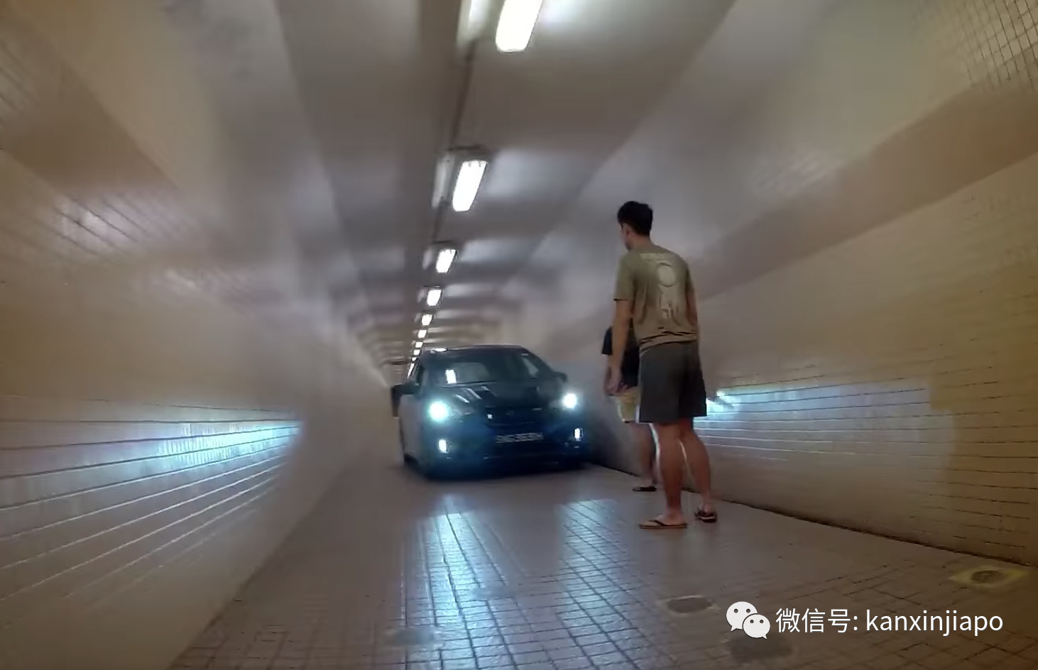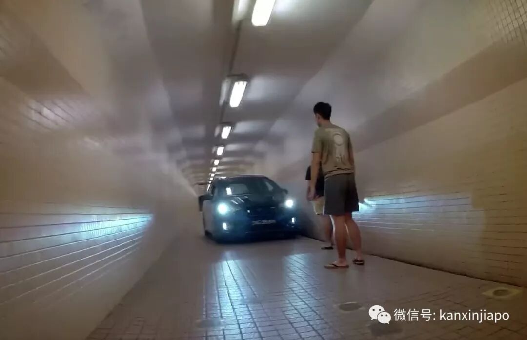 新加坡行人隧道里,半夜硬生生挤进一辆小汽车
