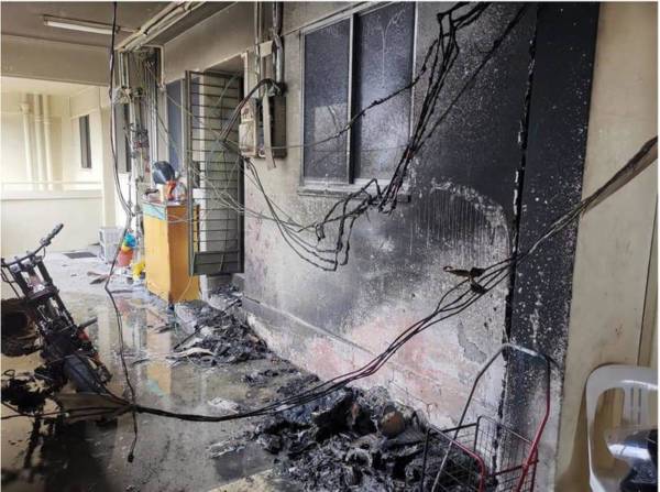 (新加坡7日讯)又一起个人代步工具火患!在走廊充电的电动脚车突起火狂烧,瞬间被烧成废铁,母亲及儿女被爆炸声惊动,三人受困屋内,急忙拨电求救,被及时赶到的民防人员救出,侥幸没受伤。