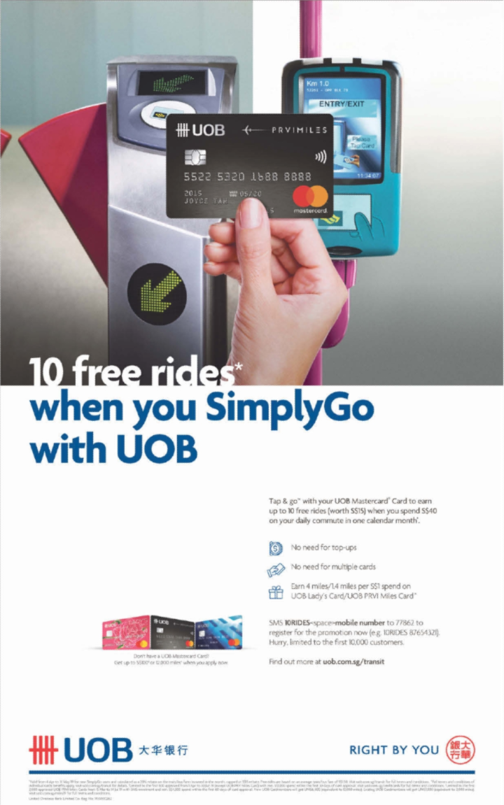 只要使用UOB Mastercard® Card在一个月内乘车/MRT满40新币