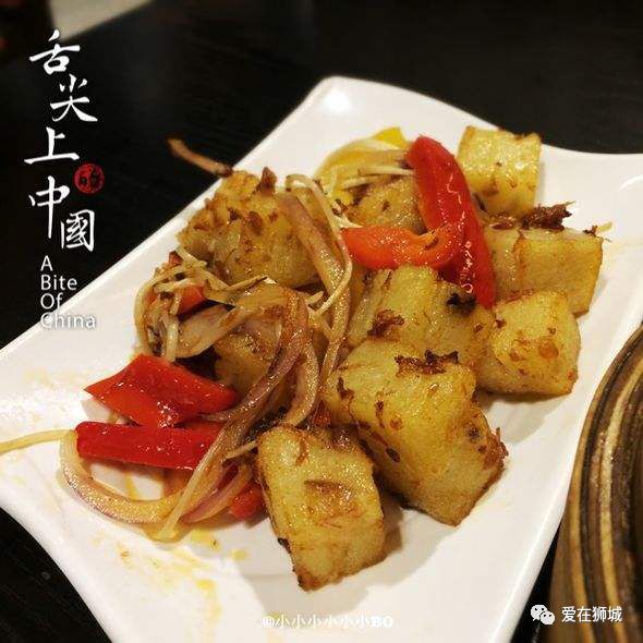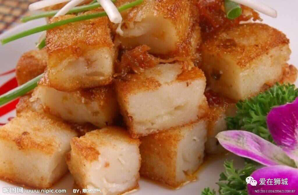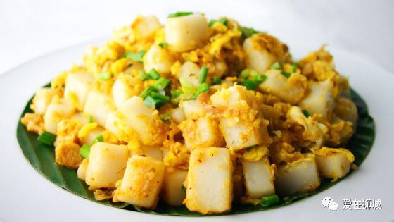 这道简单的小吃起源于中国南部的潮汕。在那里,它是众所周知的“炒糕粿”(油炸淀粉类糕点),主要由米粉制成。鱼酱和甜味黑豉油用来腌制年糕,然后切丁,和炒鸡蛋、牡蛎、虾一起炒制。