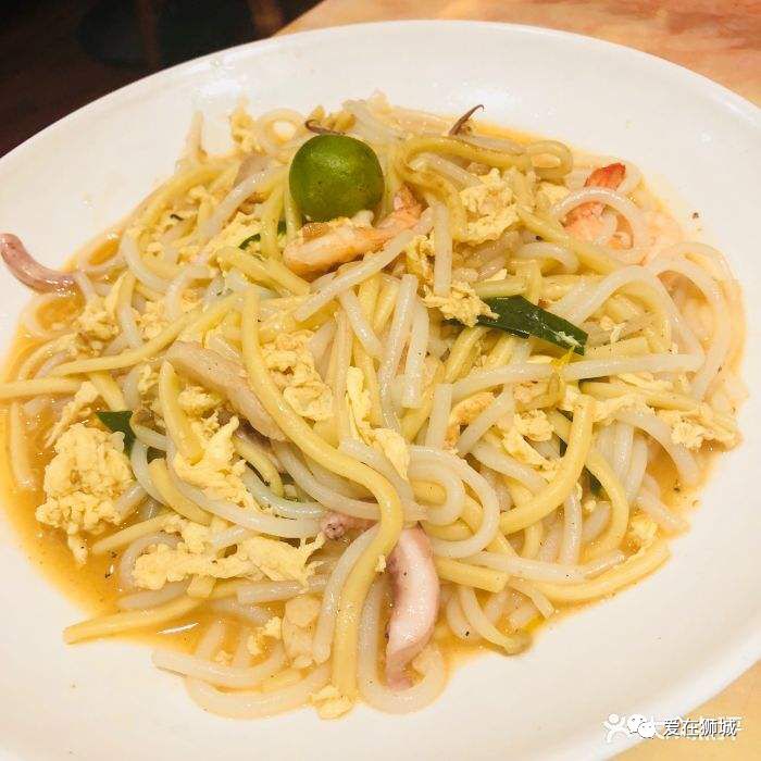 主要食材为黄色面条和粗米粉,以及鲜美多汁的大虾、鱿鱼、五花肉条、蛋花,还可选择缀以香脆的猪油渣,让一切锦上添花。上桌时佐以参峇辣椒酱再淋上一点酸柑汁,清新提味。