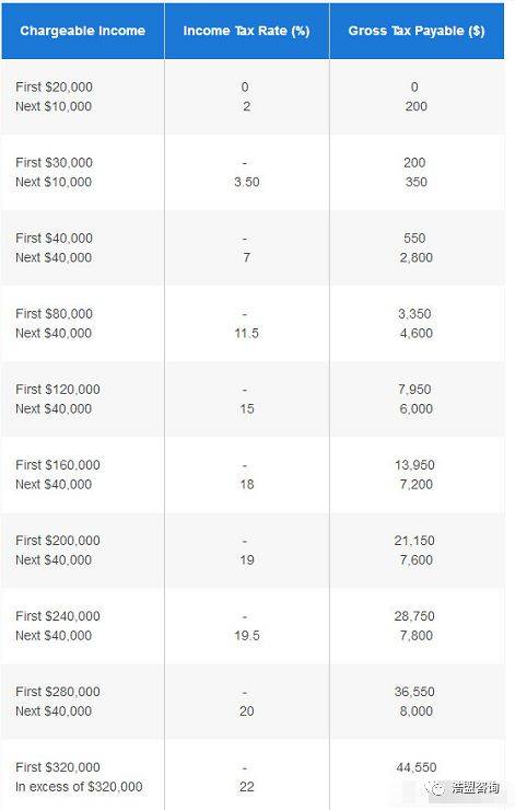 税务居民个税起征点为年收入20000新币(折合人民币约9.6万),实行0-22%的超额累进位税率,具体税率详见上表。
