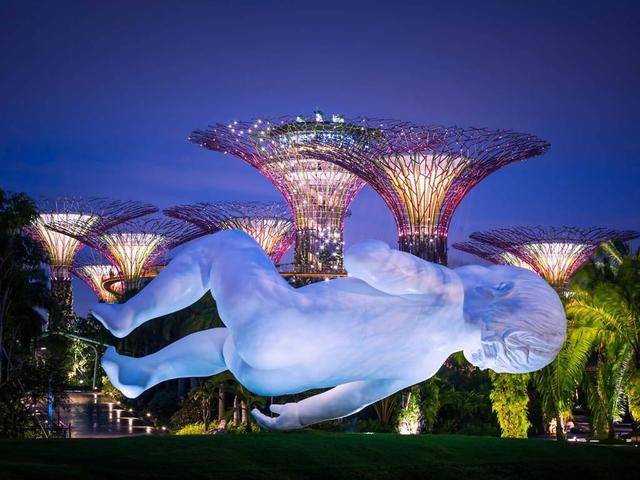 我们一行人在新加坡滨海湾花园漫步游玩时,突然,在我们的正前方惊现一个巨大的婴孩,梦幻蓝色通体,天哪!这简直就太让人震撼了,有点不相信眼前横放的这座雕塑,这座令人印象深刻的青铜雕塑似乎悬浮在天空中,在灯光效果下仿似要飞起来去寻找BaBy的自由,但其实它却重达7吨,长9米,高3米。