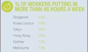 排名的最后还附加了每周工作超过48小时的人数占比。新加坡以23%的人员工作超时而排名第一。