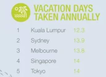 年假方面,最短的是吉隆坡为12.3天,其次是墨尔本13.8天,新加坡排名第四,年假为14天。