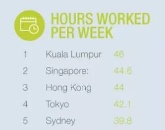 在每周工作时间排名中,马来西亚吉隆坡每周工作46小时排名第一,新加坡为44.6小时排名第二,第三是中国香港每周44小时。