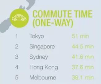 通勤时长(单程)排名里,最久的是东京,需要花费51分钟;第二为新加坡需要耗时44.6分钟;第三名是雪梨,上班需要41.6分钟。