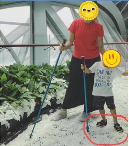 于本月1日带着穿着凉鞋的儿子成功进入“雪道”...