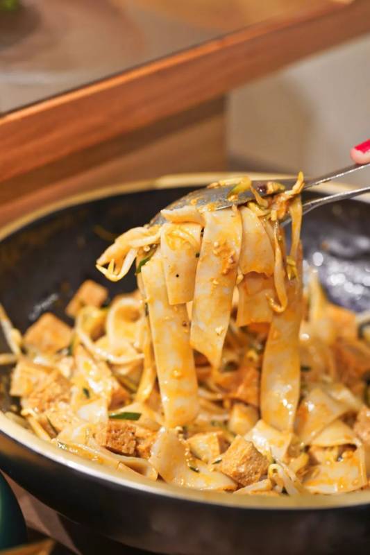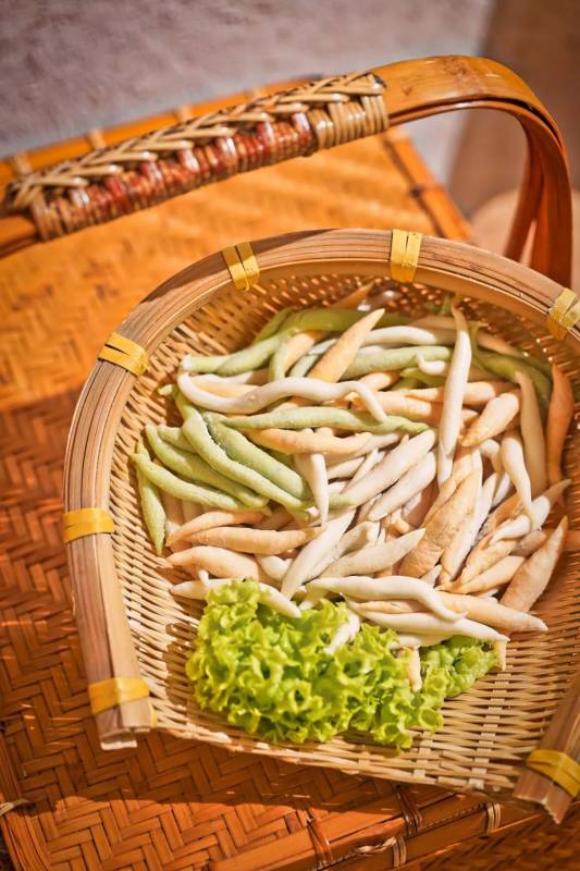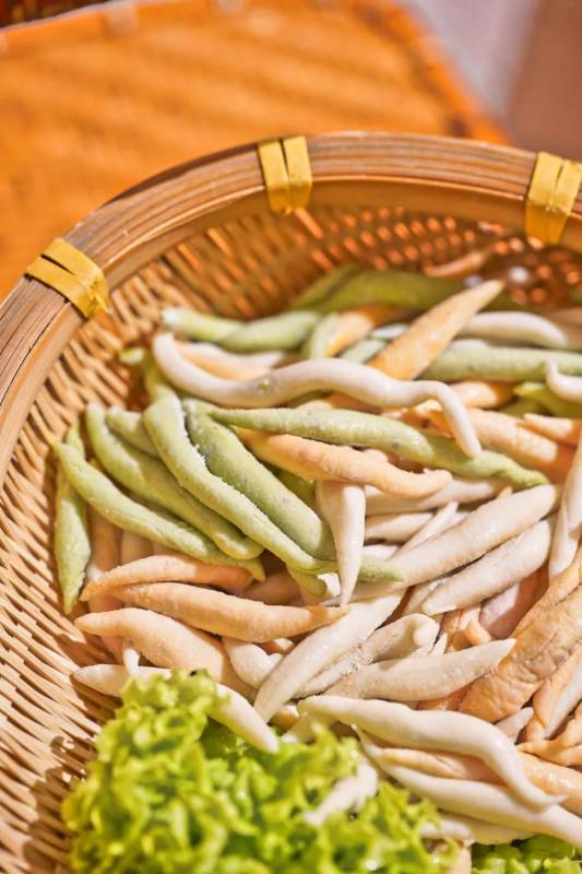 颜值担当的手搓鱼面,是厨师用榨取的菜汁制作而成的。