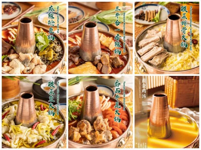 三牛合一香辣锅、酸菜排骨锅、麻辣鲶鱼锅、酸菜鱼火锅、番茄牛尾锅以及黄金鸡汤锅。