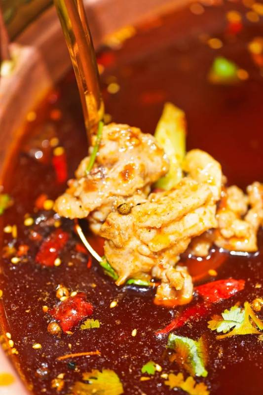 经过卤煮的兔肉丁,配上同心如意特别为这锅兔肉研发的麻辣香浓锅料汤里,只是闻一下就要被迷倒在餐桌上了。