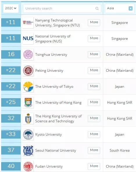 以下为NUS和NTU2019年度亚太地区的最新排名情况,稳居一二