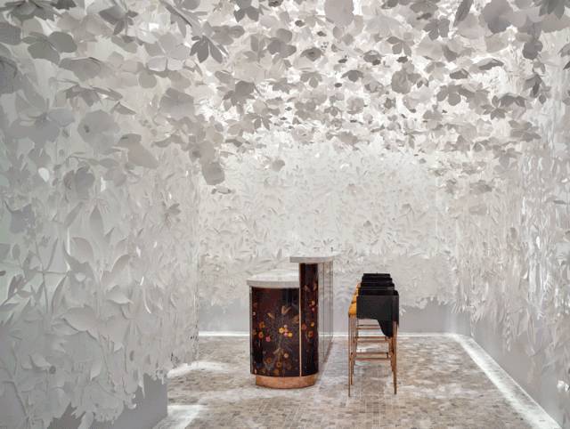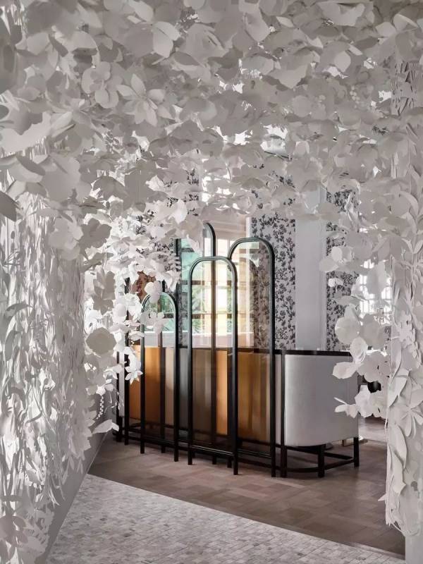 作为美食之旅的起点,餐厅入口的设计极富视觉冲击力。Aedas以花园诠释中国神话,与多伦多奢华艺术工作室Moss&Lam携手,以数千朵手工花卉为元素打造出令人印象深刻的餐厅入口,并在入口转角处设置了如同会客室的吧台座椅,其深棕色表面与花卉纹饰营造出神秘的氛围,与墙面的手工花卉一同,让人不禁产生置身于仙境的错觉。