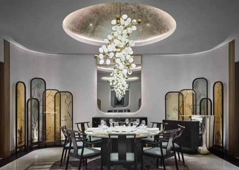 为特别的场合与特殊需求设置的私人包厢设有隔音墙系统,可以根据需求灵活调整空间。房间设计灵感来自于中国神话盘古开天地,以蛋形的香槟色穹顶佛如神话中孕育盘古的蛋,定制的枝形吊灯从中坠落,将光明带给空间。四周错落布置著中式博古架和中国风玻璃屏风,完美装点房间。
