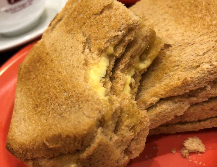 当然,除了这些连锁店,新加坡大大小小的餐室中必有一个摊位在售卖咖椰吐司,而且价格通常比连锁店更便宜。如果周围没有亚坤,就近的餐室吃一份也是OK的,比如我曾经在某个餐室吃过竹炭味的。