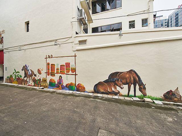 狭窄的小巷不算显眼,但在墙壁上画了一幅马帮市场的场景,描绘了早期小印度劳工的一角。