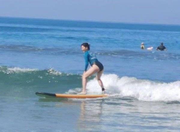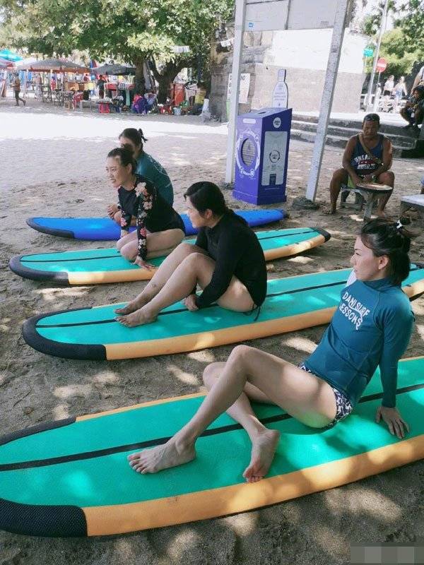 更有她大展身手、架式十足冲浪照,不过网友都把焦点放在她迷人身材上,穿着高衩泳裤的她,不仅难得露出白嫩修长美腿,还辣秀浑圆蜜桃臀,完美曲线一点不像生过孩子,身材完全没走样。
