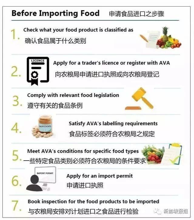 新加坡是由农粮兽医局(AVA)负责进口食品、动植物检验检疫。如肉类,蛋类及其产品只能从符合新加坡食品安全标准和要求的经批准的国家/地区的认可来源进口,都要按照以下流程登记,才能售卖。