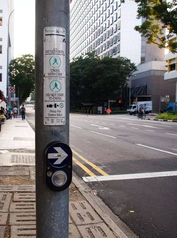 走到红绿灯路口,有些路口灯柱上有个按钮