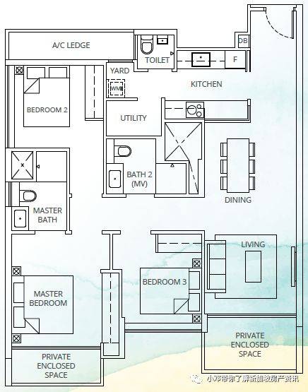 C2户型 3室 1130平方英尺/105平方米