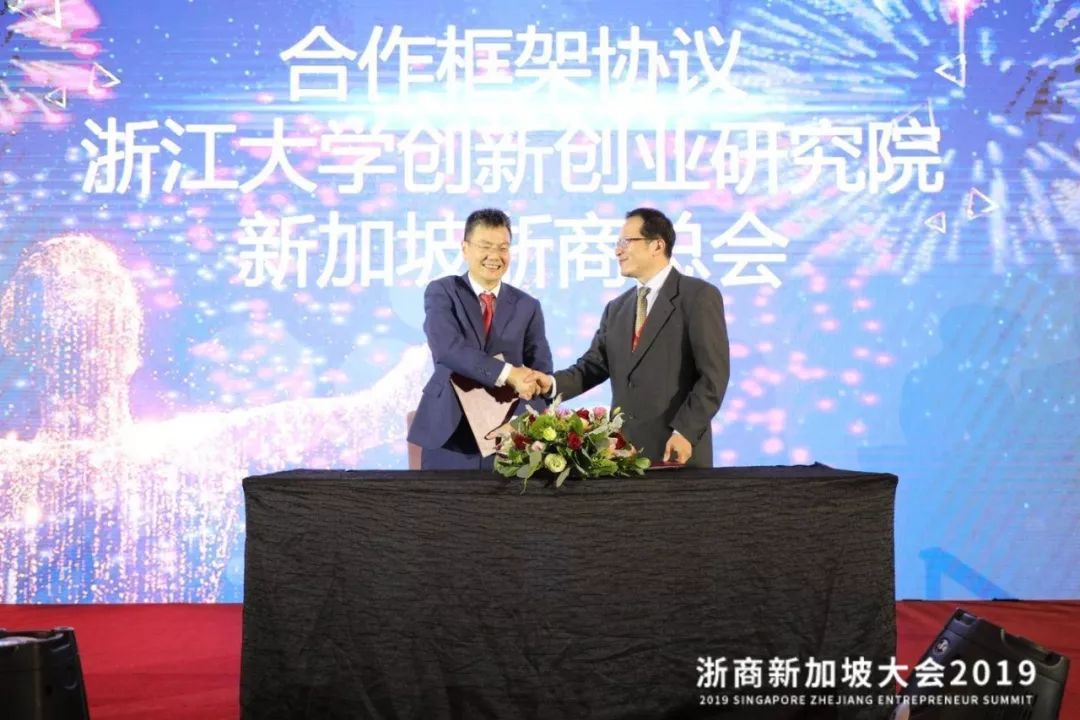 接下来,进行的是浙江大学创新创业研究院,新加坡浙商总会合作框架协议的签约仪式,双方签约代表分别为浙江大学创新创业研究院副理事长、副院长陈肖峰;新加坡浙商总会会长李国生先生。
