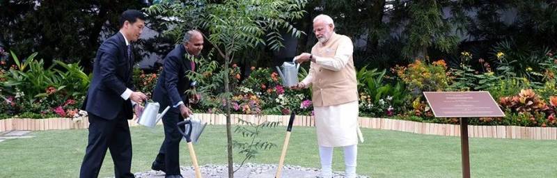 印度总理莫迪(右)和教育部长王乙康(左)以及南大校长苏布拉·苏雷什教授一起在南大校园内种下一棵印度苦楝树,象征新加坡和印度友好双边合作关系。