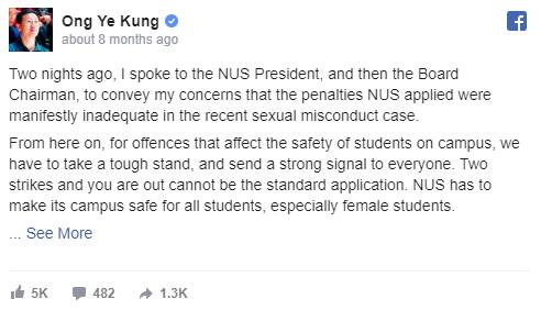 此外,王部长也对校园弱势群体,特别是新加坡高校近年来多起学生不端性行为案件表示关注。今年四月份,国大某学生涉嫌偷拍女生洗澡引发社会舆论的广泛关注,然而国大对涉及偷拍的男生处分“明显不足”。