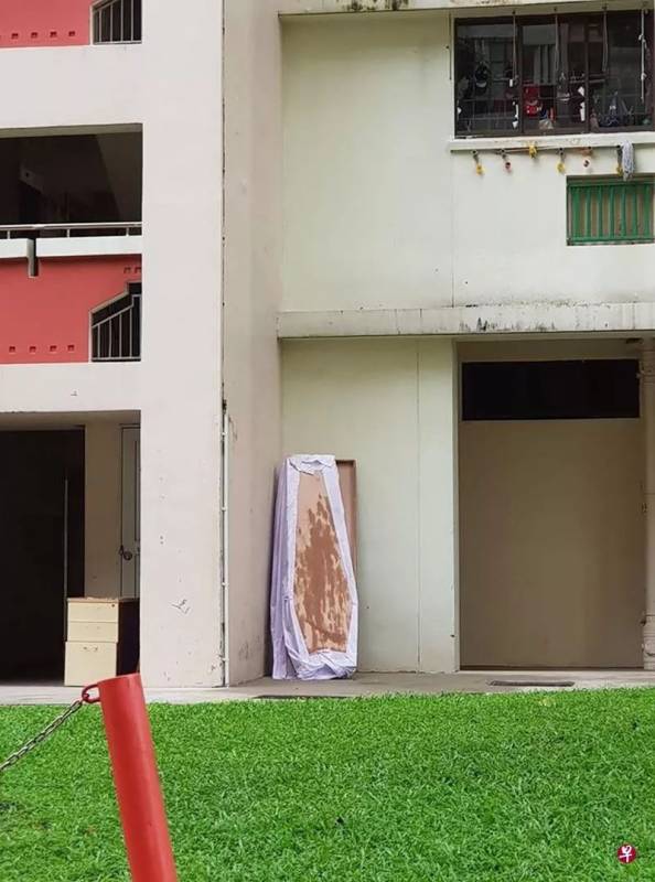 近日有公众在一座组屋底层拍到一副棺木竖立在一角,棺木包裹着一层白布,一旁还有一个小橱柜,不知是否是同时丢弃在此的。