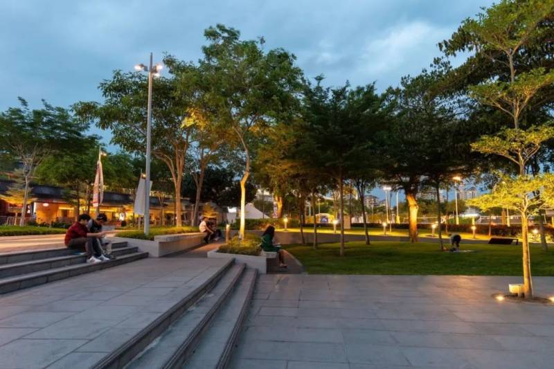 每当夜幕降临之时,周围一盏一盏的等亮起来,灯串围绕在树上,发出淡黄色的光。