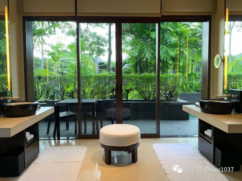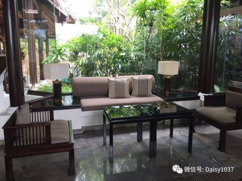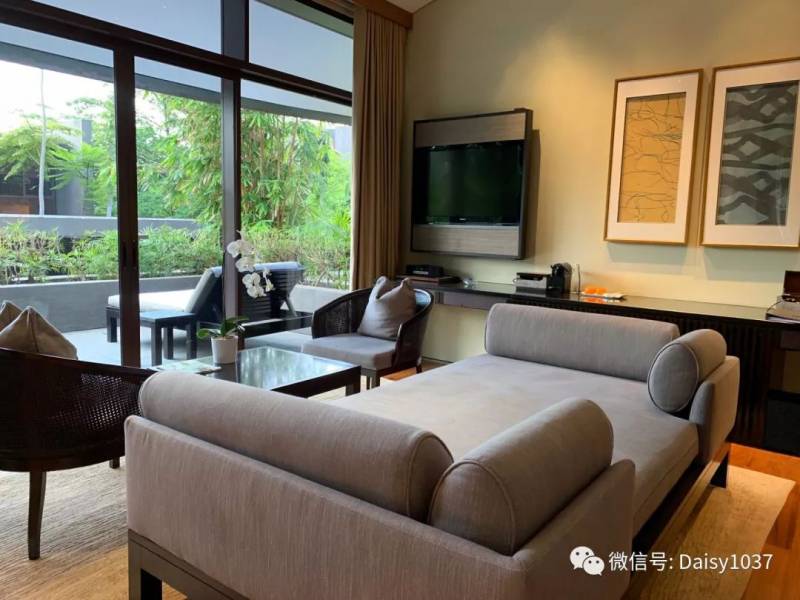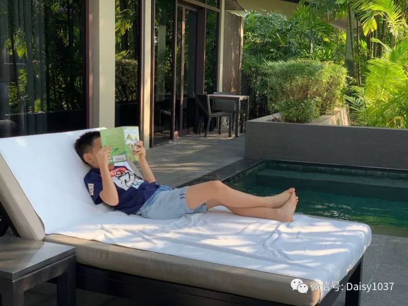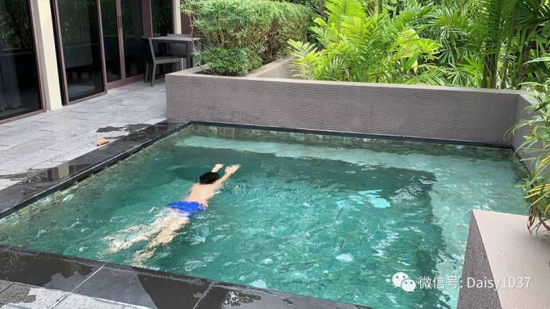 一房别墅于我们一家三口来说足够住了。客厅的坐榻在晚上开夜床时帮我们铺成了小床,仔仔睡的妥妥的。户外的游泳池比较小,但孩子玩玩水也还是不错的,浴缸也在室外,整体感觉还是很舒服的