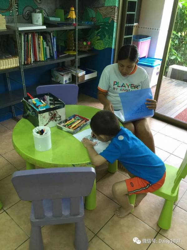 悦榕庄在海边有一个很小的Kids Club 服务员告诉我们在旁边的悦椿庄有大的儿童中心,于是我们坐上高尔夫球车去逛逛。有专门的阿姨陪着他画画,还真是不错哒