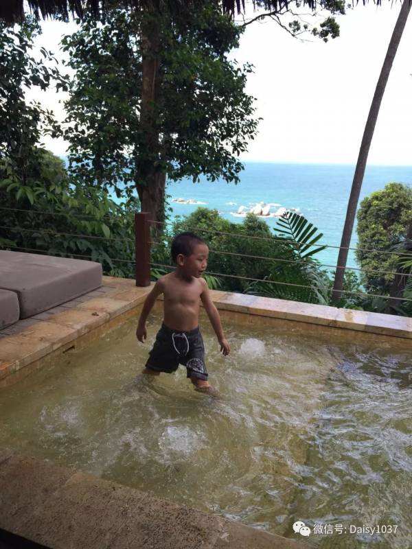 房间不算非常大,但给我们一家大小还是足够了。与其说泳池还不如说是按摩池吧,仔仔在池子里跳来跳去准备压住水柱,自娱自乐好不开心