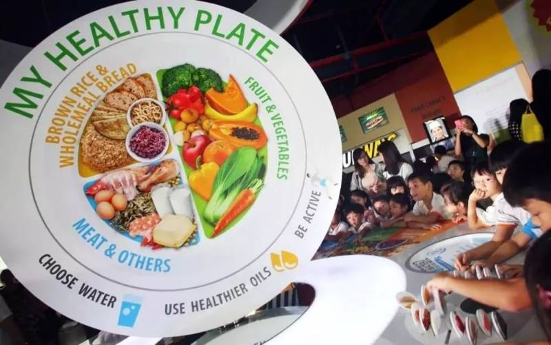 新加坡的小学生在参观健康饮食的展览,从小“吃健康饮食,习惯成自然”。