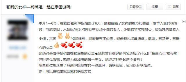 去年有粉丝和陈莉萍一同出游,赞她谦虚低调、关爱老人孩子、有求必应。
