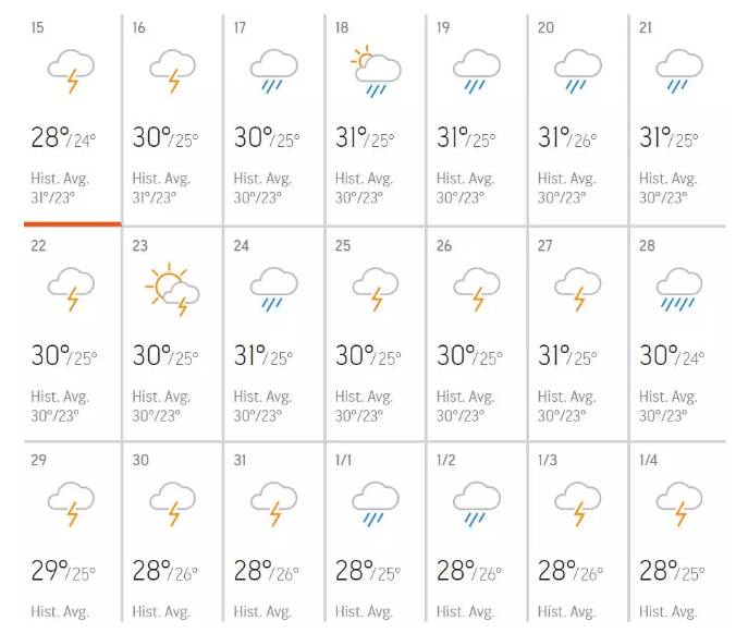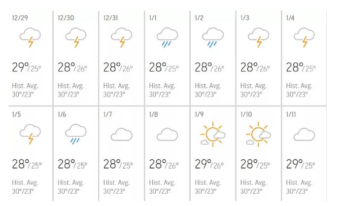 根据AccuWeather上最新的新加坡气象预测,这种潮湿阴雨的天气将会持续到2020年1月中旬,温度低至23℃。