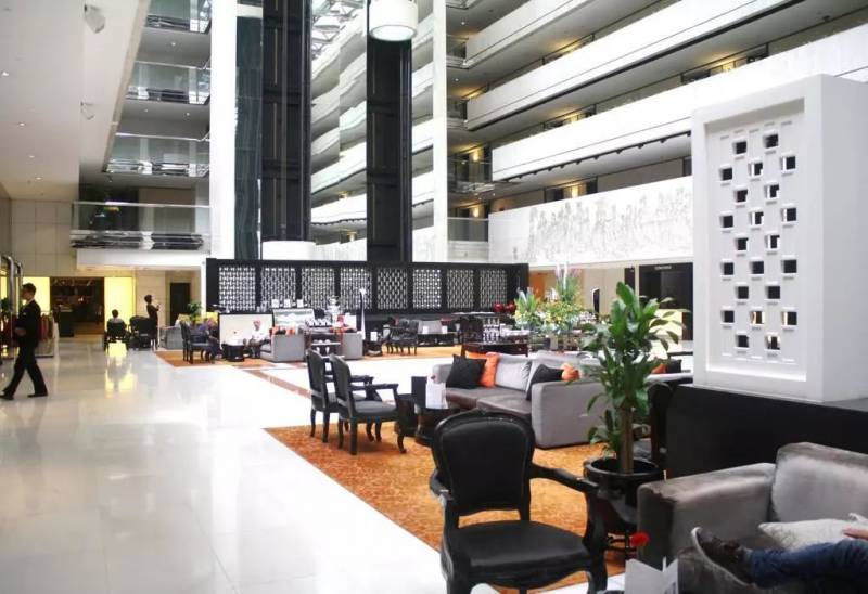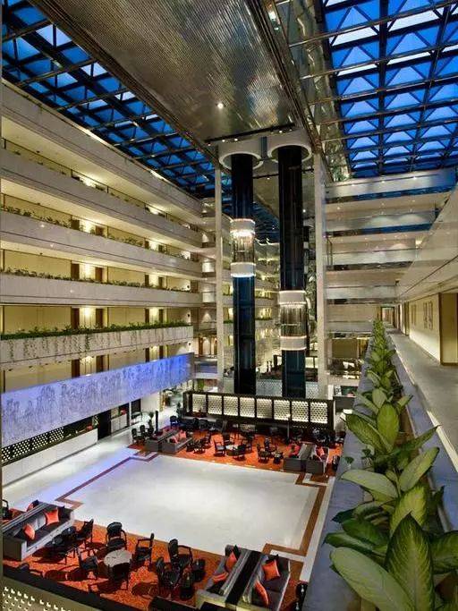 酒店大堂是六层挑高空间,抬头是万花筒般的玻璃窗顶,各层楼之间由全透明的电梯连接,非常梦幻,也是一个超级网红打卡点哦~