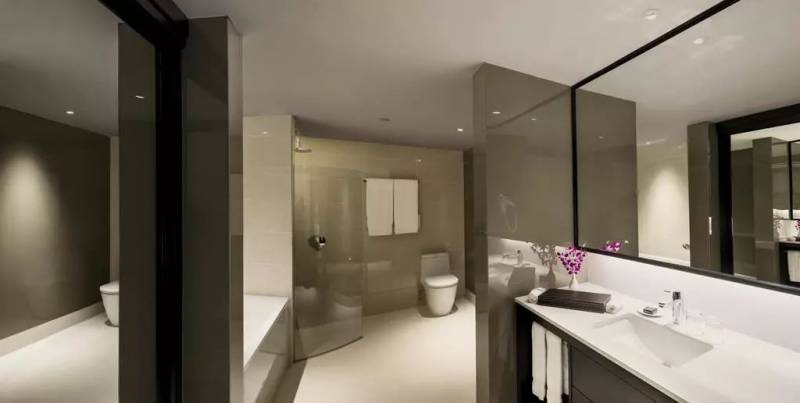 酒店的客房是现代的极简风格,冷调的配色有一种摩登现代感。宽阔的落地窗将周围繁华的城景尽收眼底,又能在繁华的街道中享受自己的私密空间。