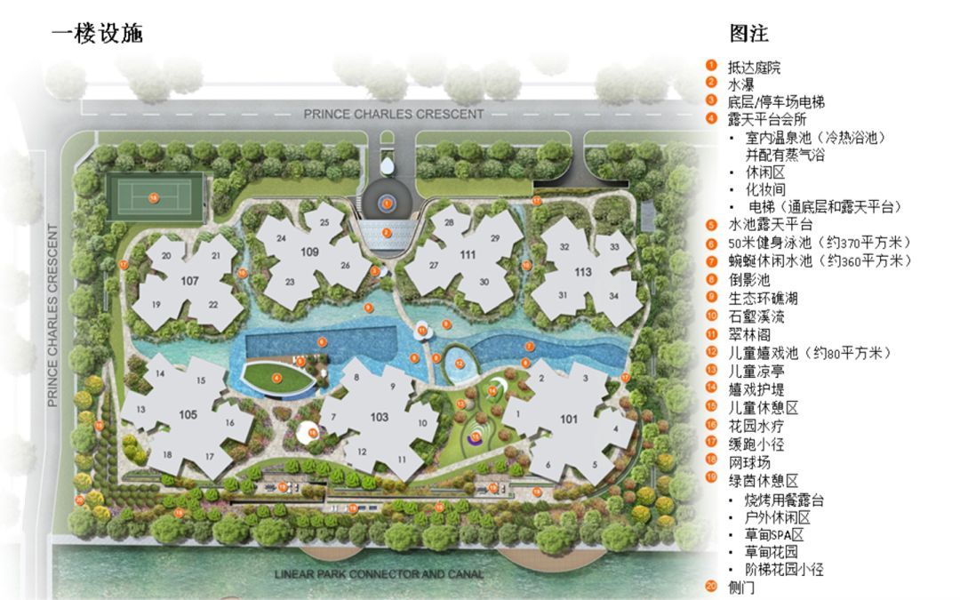 社区内更配备有完善的休闲、娱乐设施,其中一楼设施包含有露天平台会所、水池露天平台、50米健身泳池、儿童嬉戏池、绿荫休憩区、花园水疗、缓跑小径等,为业主提供高端生活方式。