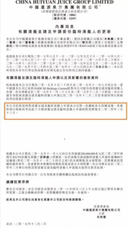 因为关联交易违规贷款,汇源果汁自2018年4月3日开始停牌,目前已经停牌超过20个月。按照港交所规定,如果汇源果汁未能于2020年1月31日前完成复牌条件,将被启动退市程序。