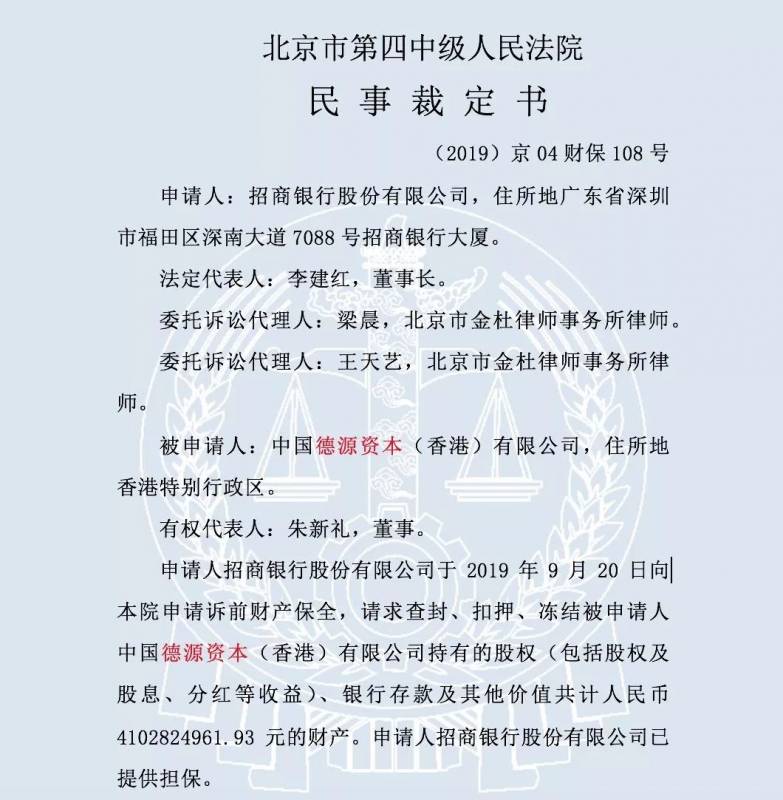 近期,中国裁判网披露的一份民事裁定书暴露出汇源果汁的危机,招商银行于2019年9月20日向法院申请诉前财产保全,请求查封、扣押、冻结被申请人德源资本持有的股权、银行存款等共计41.03亿元的财产。而德源资本的有权代表人,正是汇源果汁创始人朱新礼。