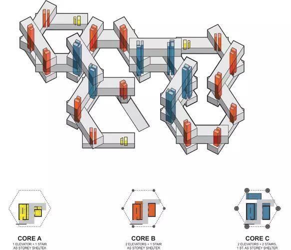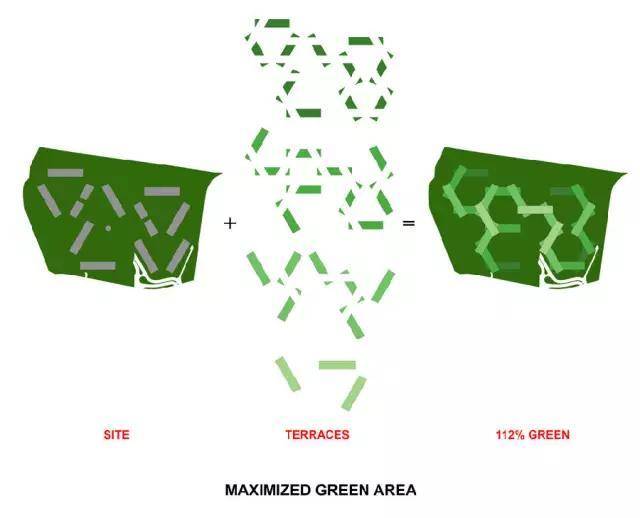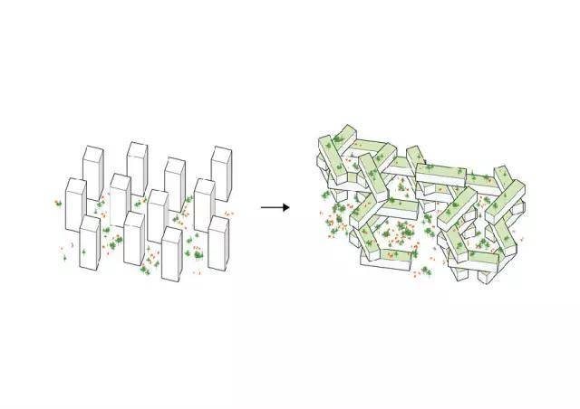 公共外部区域和共享空间交织在一起在成群的塔楼中穿拆错落的出现