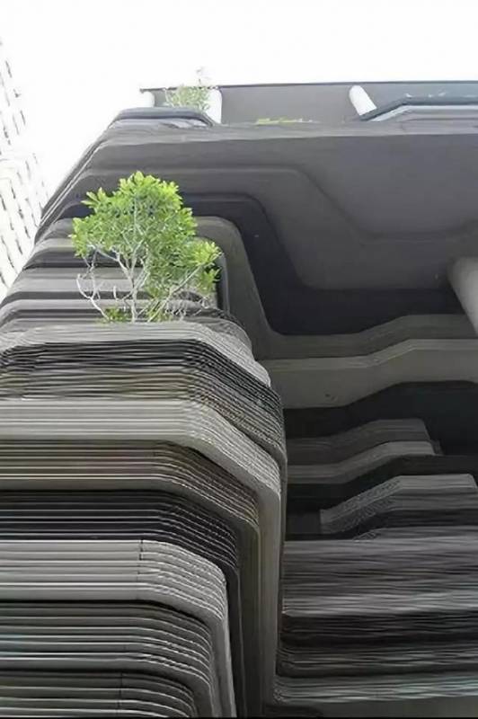 预制混凝土承重柱如同整齐排列的士兵撑起巍然耸立的大楼,平台的底部借鉴了侵蚀岩石的横纹肌里,横向纹理缝隙间恰当的栽植了藤木和花草。