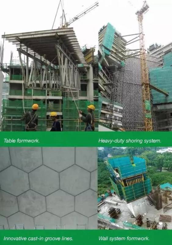 项目设计了七个预制重型脚手架分段套件,用以跟上每个构件的施工周期。与传统的脚手架系统相比,估计的生产率提高约为115%。同时大量使用预制构件,包括民防门框,楼梯,种植箱和双层板。与现浇施工相比,这些预制构件使生产率提高了约80%。另外,项目还采用各种生产模板,如水平工作台模板和立式钢模板,缩短了施工周期。与传统的木材模板相比,估计的生产率提高了约80%。