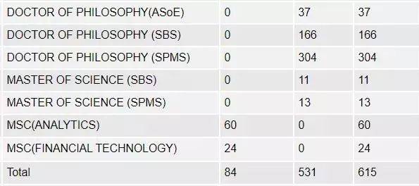 2019-2020学年,理学院共招收本科生3541名,授课型研究生84名,研究型研究生531名。其中硕博项目的具体情况如下。(三列数据分别对应授课型、研究型、单行总数)
