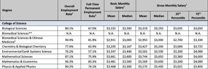 理学院本科毕业生平均就业率在85%左右,其中数学与经济专业的就业率达到96.3%之高!毕业后每月工资中位数为S$3500左右。以下为2019年发布的NTU理学院本科毕业生薪资统计报告。