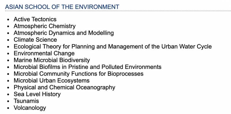 亚洲环境学院(ASE)是一个年轻的跨学科学院,结合了地球环境科学、生态学、工程与技术、人类生态学、人类学和社会科学,致力于解决以东南亚为重点的气候变化、地质灾害、可持续发展和全球环境变化等环境问题。NTU环境研究在QS世界大学专业排名中为第14名。