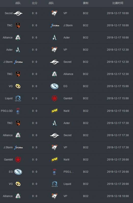 这次比赛小组赛采用BO2,小组前二晋级胜者组,三、四位晋级败者组,后两名则会被直接淘汰,第一天的赛程如下: