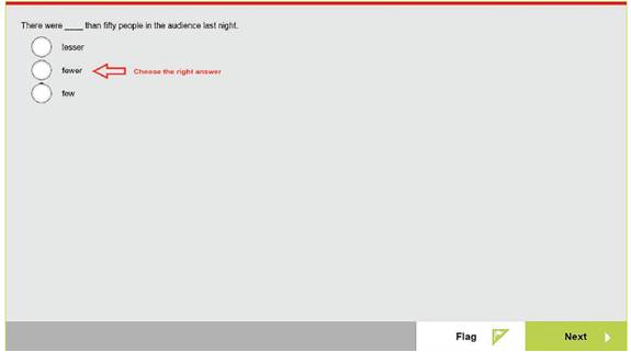 少数问题考察英语口语,例如知道在特定情况下使用适当的语法(如正式或非正式情况下)。所有25个问题均采用有三个选项的单选题形式。