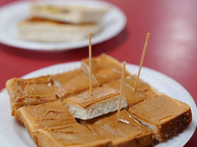 上篇介绍的亚坤餐厅成立于1944年,他们把咖椰酱和黄油直接涂抹在吐司上,但是创立于1939年的东亚餐室东亚餐室把咖椰酱和黄油嵌在每片吐司中间,让烘烤吐司的余温软化黄油,使黄油和咖椰酱融为一体,味道非常和谐。
