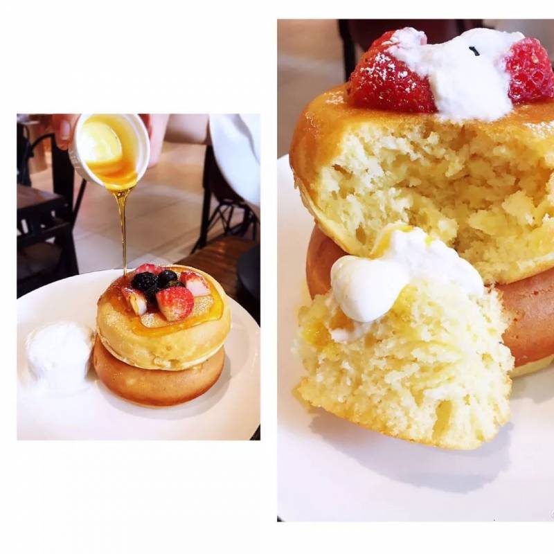 跟普通的松饼由多块薄松饼叠成不一样,pancake tower是由两块胖嘟嘟的厚松饼叠在一起。表面看似扎实,但里面却很松软。